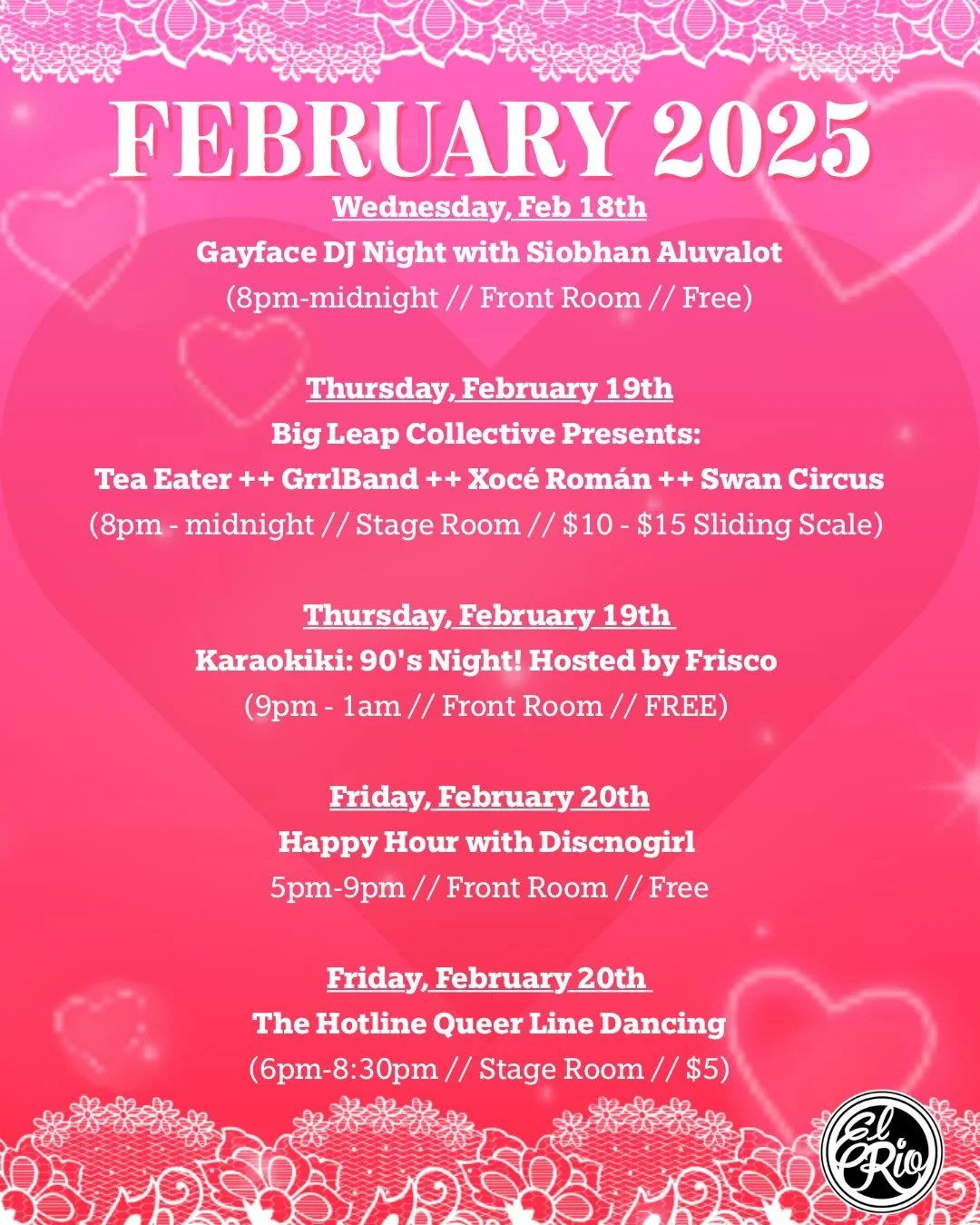 El Rio rejects all forms of violence both physical and emotional. As a shared community space we expect our guests to uphold the significance of mutual respect and the allowance of expression in all forms. We are a queer space, We priorITIze our BIPOC and Latine family. We believe trans women and men are sacred. We have no room for hatefulness and encourage anyone who sees something that makes them uncomfortable to please grab a staff member and alert them. We are trained in de-escalation and will do our best to resolve the issue.